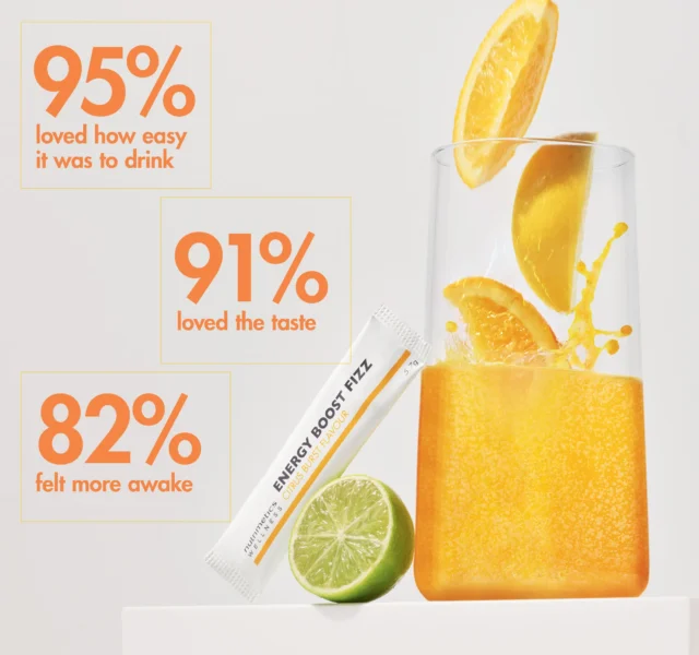 Dehydration is a major energy zapper. Drinking enough water keeps your body functioning at optimal levels. Start your day with a glass of water and continue sipping throughout. You can keep your hydration levels up AND spark energy with Energy Boost Fizz. This delicious Citrus fizz drink is loaded with Vitamins and designed to contribute to the reduction of tiredness and fatigue. Mix with water and drink a glass a day to improve mental alertness and increase focus. Caffeine from Green Tea and Guarana will give you a boost, naturally.