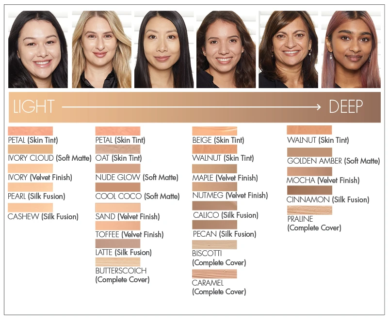Foundation coverage ranges from sheer to full.