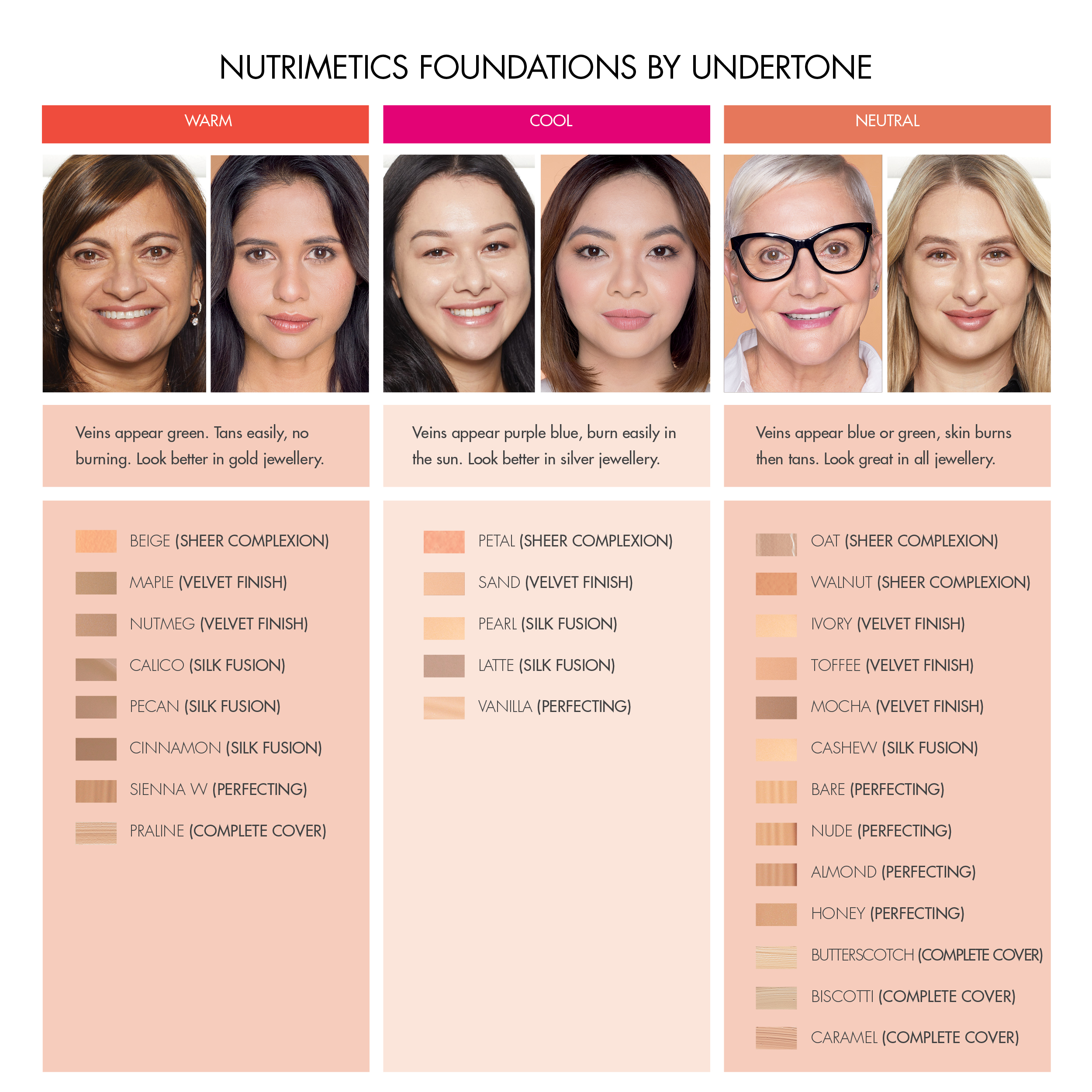 Am I warm? Hold the salmon, cream and red swatches up against your face. When you put these colours next to your skin, if you are warm, your complexion will look fresh against these colours. Am I cool? Use the pink, white and crimson swatches below by holding them up against your face. When you do this, if you are a Cool, your complexion will look fresh against these colours. Am I neutral? If both look good against your skin, you are neutral. Now you know your skin undertones, you can choose your foundation from this chart.